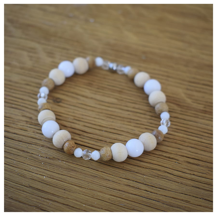 Elastyczna gumka zapewnia dopasowanie do każdego nadgarstka, a kamienie takie jak kryształ górski, jadeit biały pięknie się prezentują.
